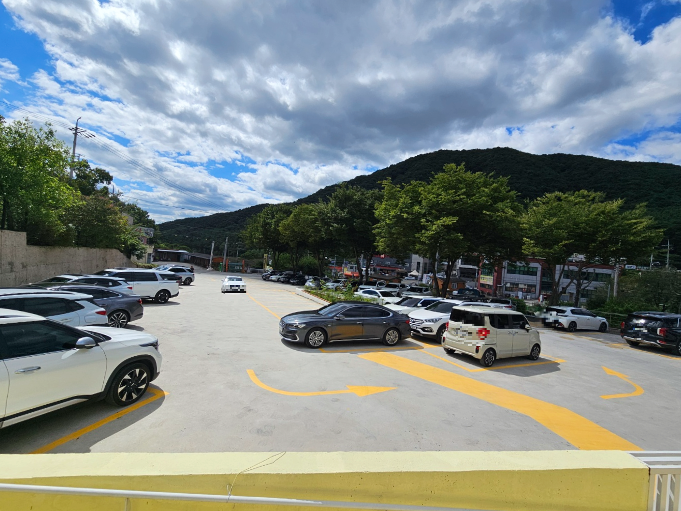대구 팔공산 계곡뷰가 있는 초대형카페 버터앤브루의 전용 주차장이에요. 전용주차장이 워낙 크고 넓었지만 인기가 정말 많은 곳이여서 주말이나 공휴일은 주차하기 힘드실거에요ㅠㅠ