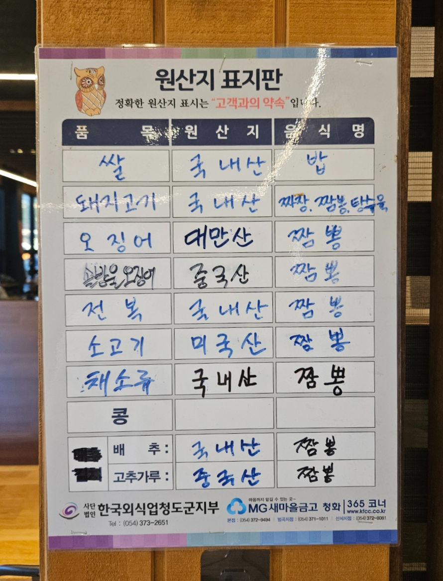 청도 밥집 이지비짬뽕 중식당의 원산지 표지판이에요. 오징어와 짬뽕에 들어가는 고춧가루를 제외하면 전부 국내산이고 고춧가루만 중국산이었어요.(중국산에 예민한편..)