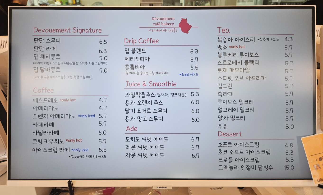 디브몽트 카페의 메뉴판이에요.