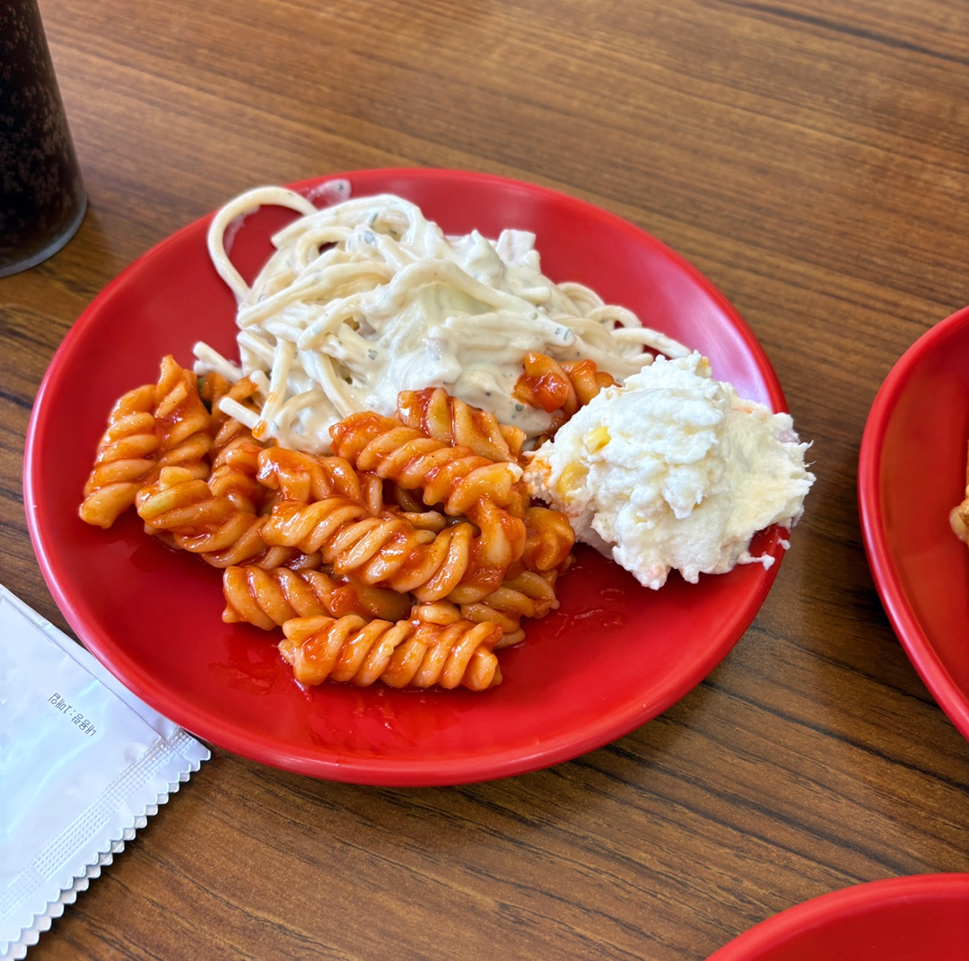 맛살샐러드, 파스타, 크림스파게티 이렇게 있고