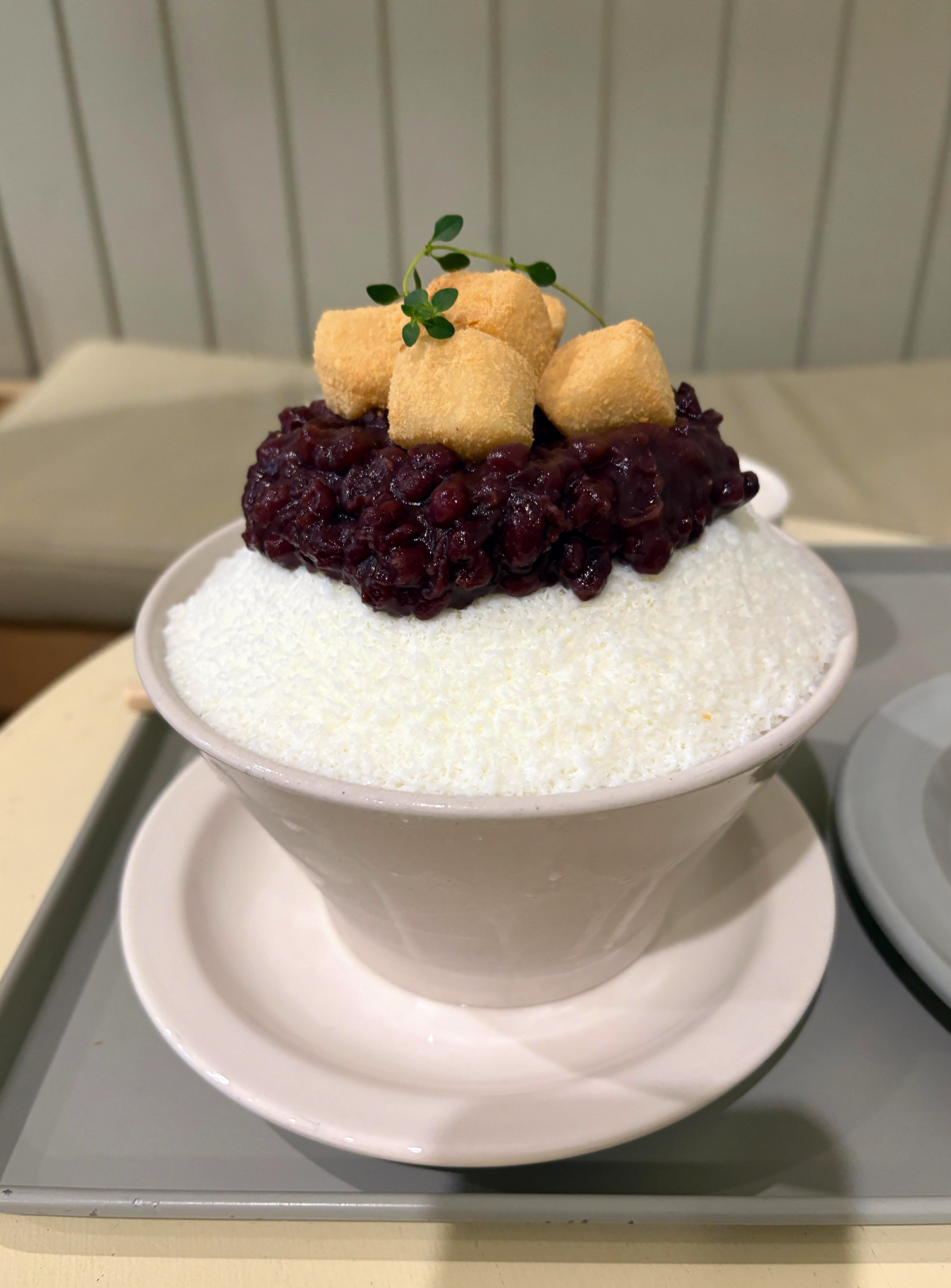 일단 비주얼부터 너무 예뻐서 먹기 전 자연스레 카메라부터 켜게 되었어요. 일반 얼음이 아닌 입자가 아주 고운 우유 얼음 위에 수제 팥이 듬뿍 올라가 있고, 그 위엔 고소한 인절미떡에 초록잎 토핑까지 완벽한 조합이었어요.