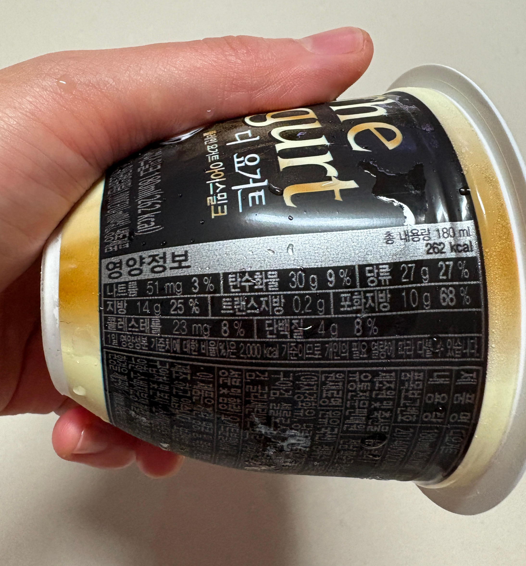 - 영양정보: 총 내용량 180ml 262kcal / 탄수화물: 30g 지방 14g 포화지방 10g 당류 27g 단백질 4g