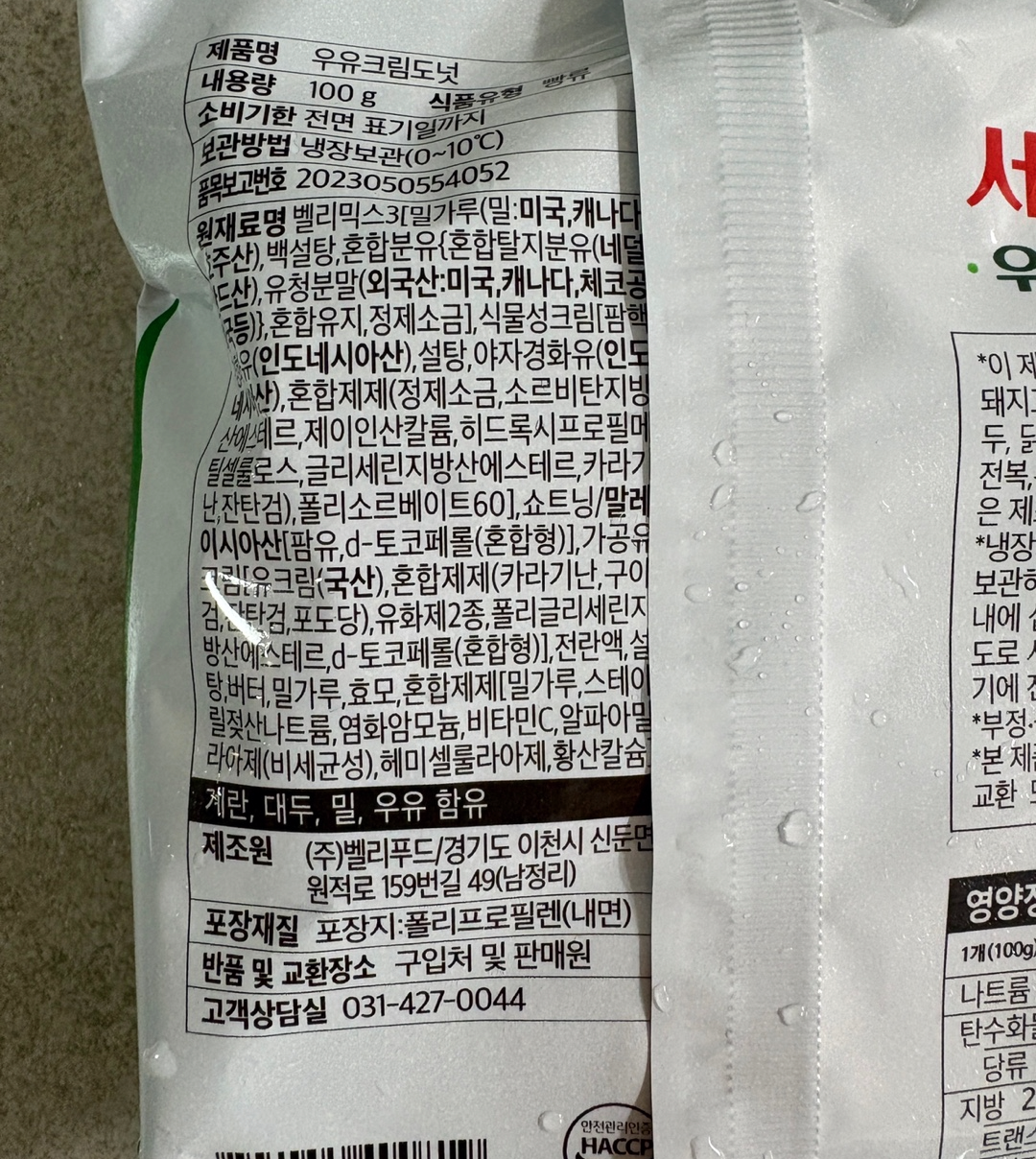 서울우유 우유크림도넛의 원재료명과 영양정보에요.