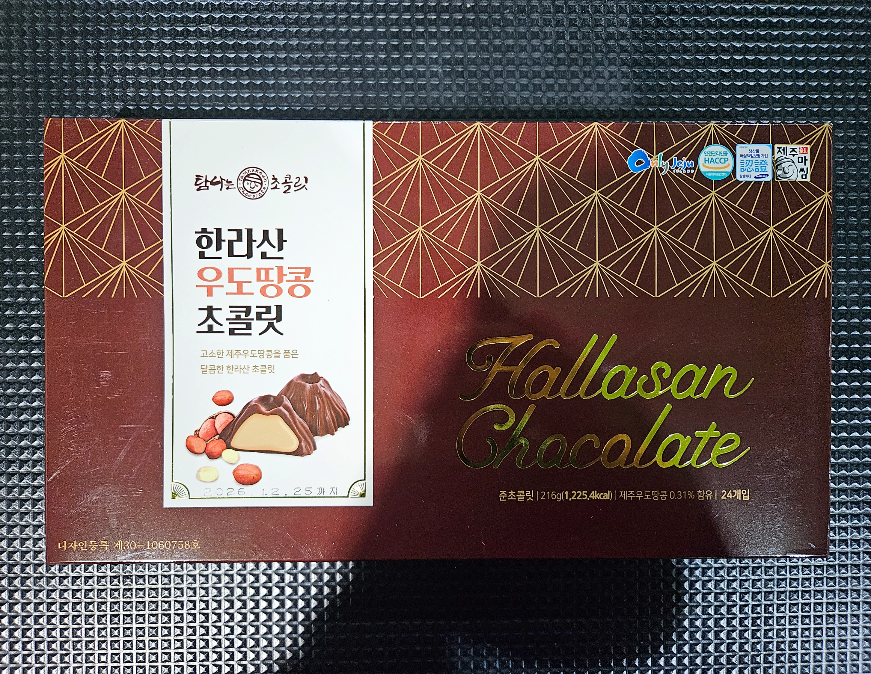 한라산 모양을 하고 있는 제주도 우도 땅콩을 품은 고소 하면서도 달콤한 한라산 초콜릿입니다. 항상 제주도 초콜릿 하면 제주감귤 초콜릿이 대표적인 초콜릿이라고 생각했고, 또 식상하기도 했는데 한라산 모양을 하고 있는 우도 땅콩 초콜릿으로 제주도 느낌 제대로 느낄 수 있었습니다. 가격도 만원 초반대로 부담스럽지 않아 가벼운 선물로 참 좋습니다.