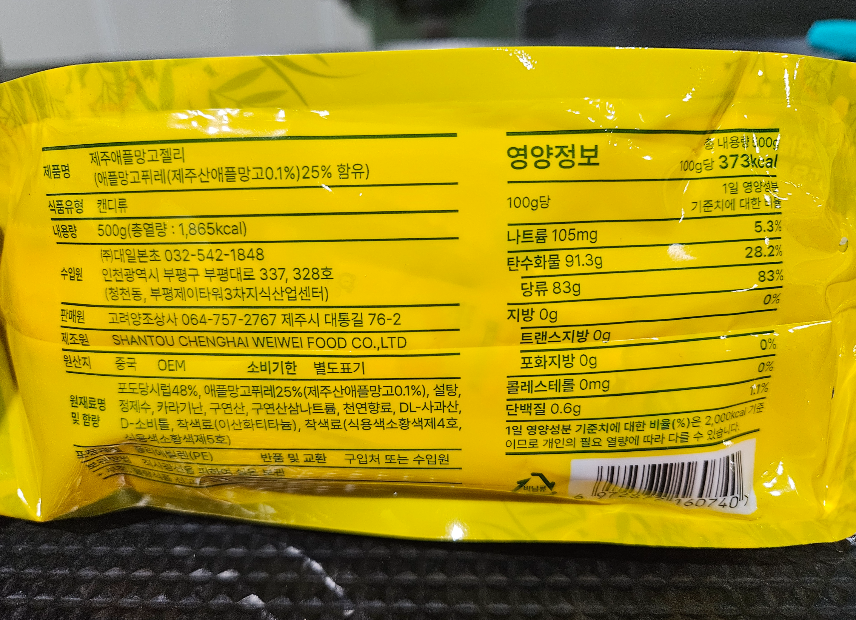 두 번째로 추천드리는 제주도 여행 간식 선물 제주 애플 망고 젤리입니다. 쫀득쫀득하면서 말랑말랑하고 달콤한 애플망고맛으로 누구나 좋아할 맛이에요. 가격은 대략 12,000원 정도이고 마찬가지로 부담 없는 가격대라 가벼운 선물로 손색없습니다. 한 봉지 500g으로 양도 꽤 넉넉한 편이어서 직장 동료들과 나눠먹기도 좋습니다. 500g 총열량은 1,865kcal이고 100g에 373kcal로 칼로리와 당류가 높은 편이라 아무 생각 없이 막 집어먹다간 살찔 수 있습니다. 제주산 애플망고가 0.1% 함유되어 있네요.