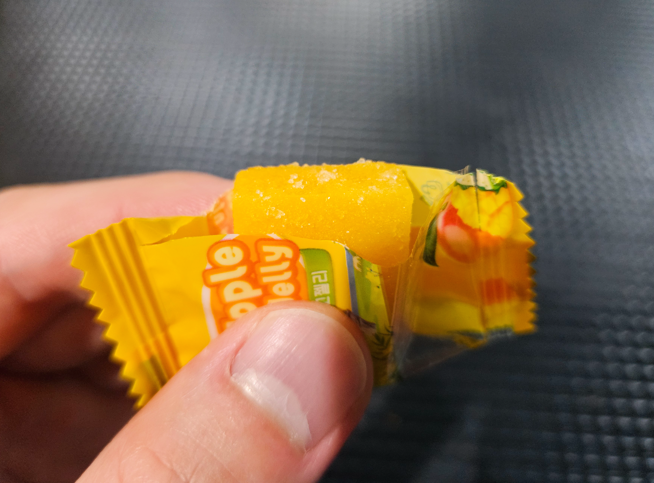 제주 애플망고가 0.1%밖에 들어가지 않았지만 달콤하고 맛있는 애플망고향기가 정말 진하게 느껴졌습니다. 식감은 말캉말캉하면서 부드럽고 쫀득과 찐득 사이정도 되는데 이빨에 조금 들러붙는 편이긴 한데 애플망고맛이 아주 맛있어서 순식간에 2~3개는 먹게 됩니다. 조심하세요.